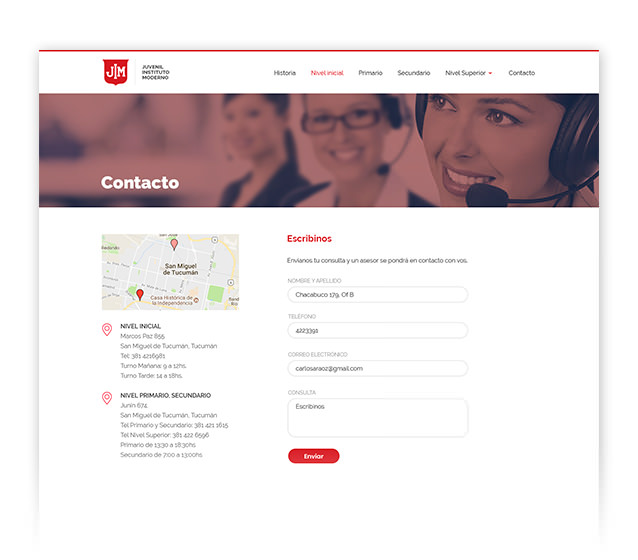 Tuvimos el placer de trabajar en el diseño y desarrollo del sitio web del instituto JIM. Con una destacada trayectoria de mas de 50 años formando niños y jóvenes de la provincia. Resultó ser un importante desafío, para intentar transmitir la calidad del instituto, en su sitio web y convertirlo en su principal canal de comunicación digital. También nos encargamos, desde su lanzamiento, de la gestión integral de la comunicación del instituto en medios digitales, a través de sus redes sociales, con diferentes acciones y campañas de marketing digital.