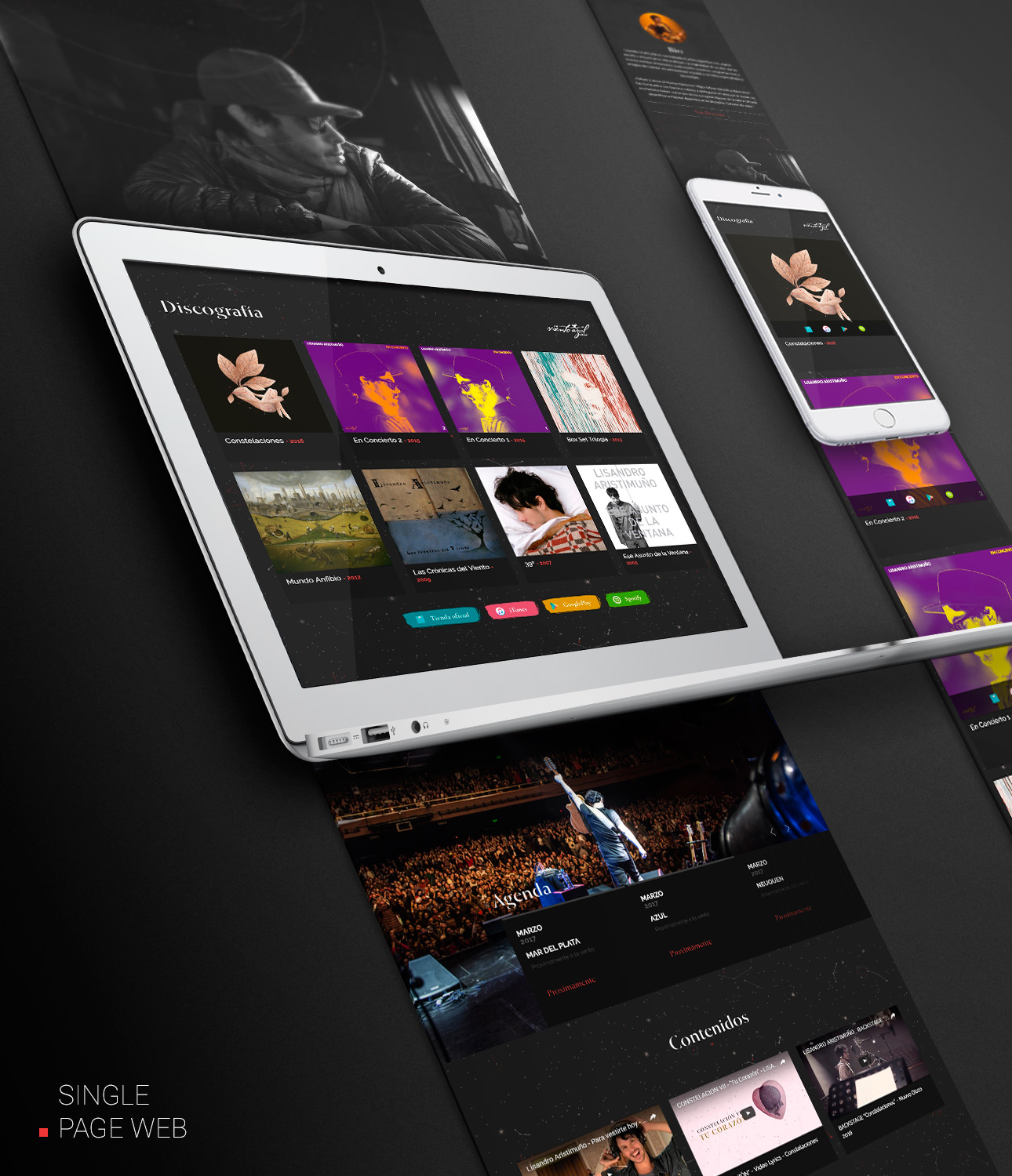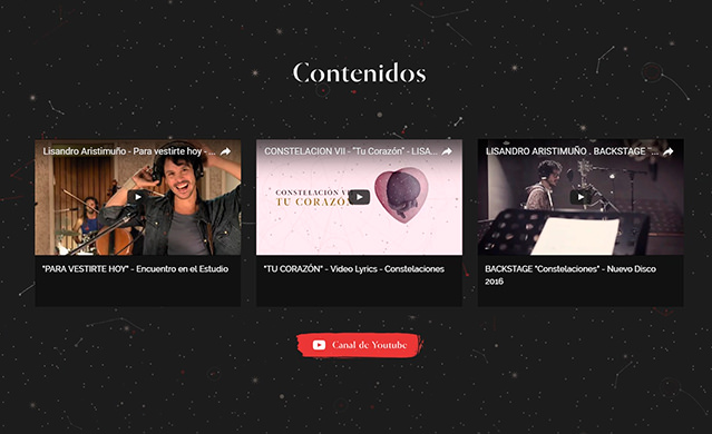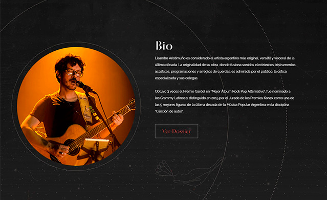 Trabajar con Lisandro fue una gran experiencia, intentar desde el diseño transmitir y representar su arte fue nuestro desafío. Crear un sitio moderno, accesible para dispositivos móviles y que a su vez refleje el estilo propio de este gran artista. Basado en su último disco “Constelaciones” nos propusimos crear un sitio dinámico, libre y atractivo.