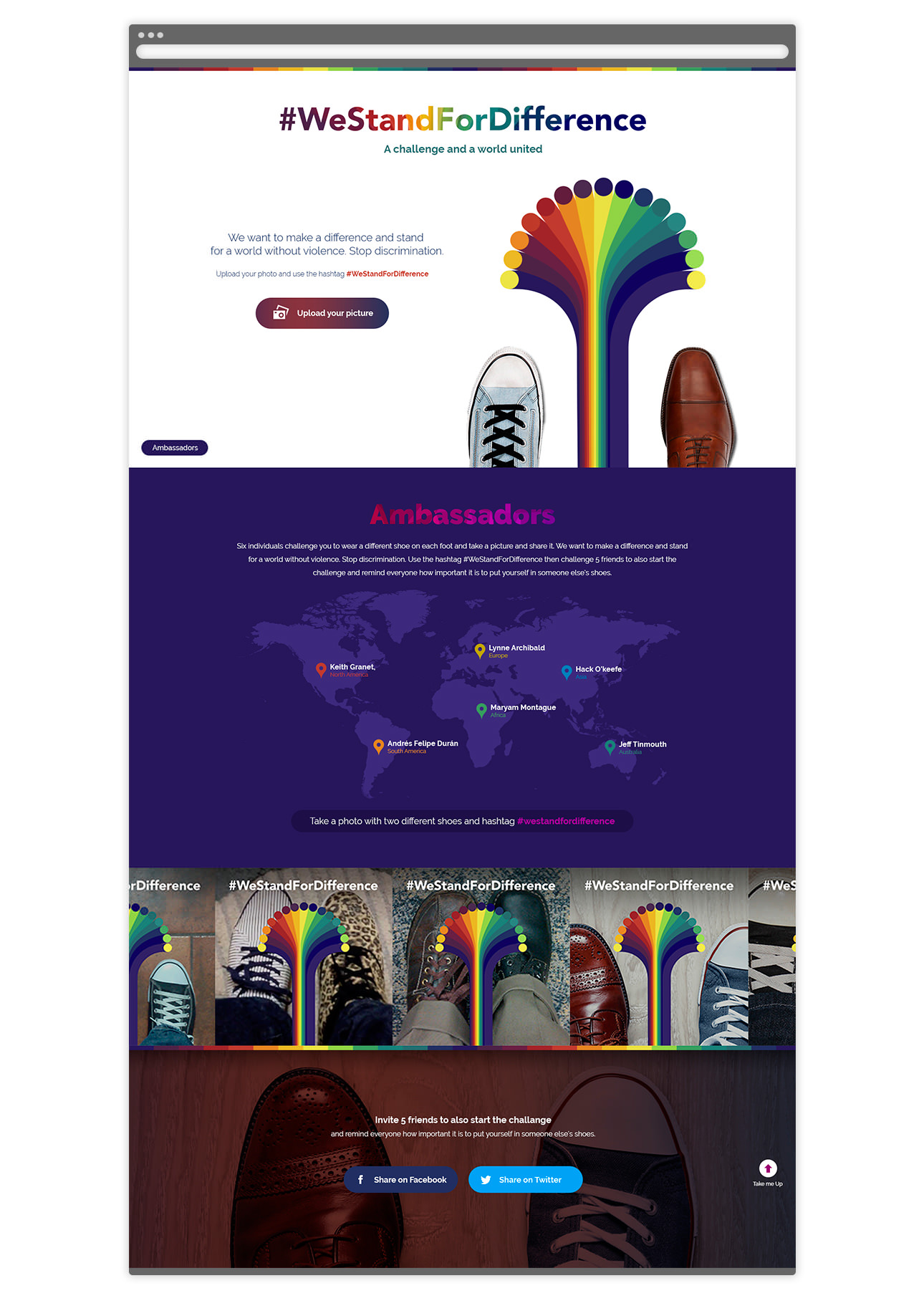 Nos convocaron para diseñar y desarrollar un micrositio (LandingPage) que actuara como eje central de la campaña #westandfordifference, para concientizar acerca de las diferencias de genero, por un mundo sin violencia y detener la discriminación.